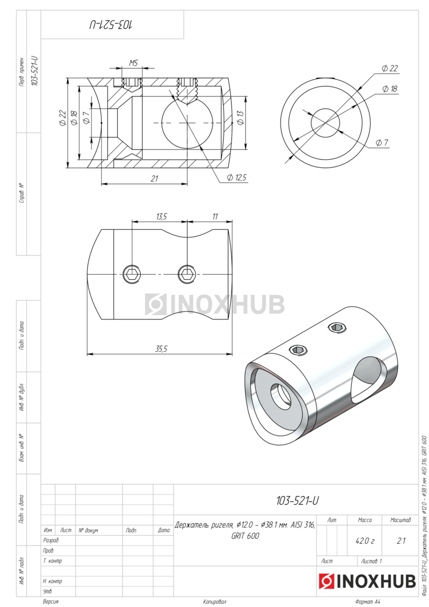 Держатель ригеля, Ø12.0 - Ø38.1 мм, AISI 316, GRIT 600, в соответствии отраслевым стандартам из коррозионно-стойкого материала. Изделие применяется в составе металлических, стеклянных или комбинированных конструкций, где важны точные размеры, прочность соединений и стабильность в эксплуатации. Может использоваться при внутреннем и наружном монтаже — в зависимости от поставленной задачи и совместимых компонентов.