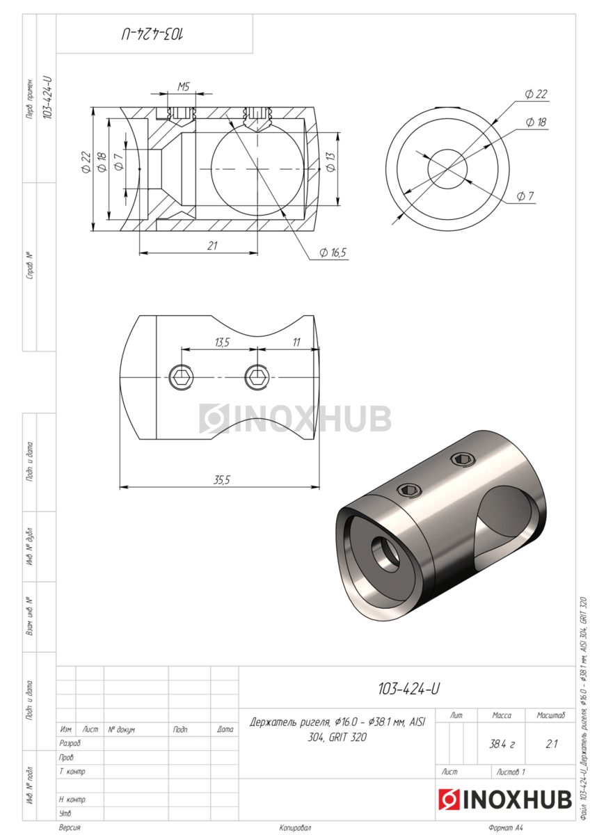 Держатель ригеля, Ø16.0 - Ø38.1 мм, AISI 304, GRIT 320, в соответствии отраслевым стандартам из коррозионно-стойкого материала. Изделие применяется в составе металлических, стеклянных или комбинированных конструкций, где важны точные размеры, прочность соединений и стабильность в эксплуатации. Может использоваться при внутреннем и наружном монтаже — в зависимости от поставленной задачи и совместимых компонентов.