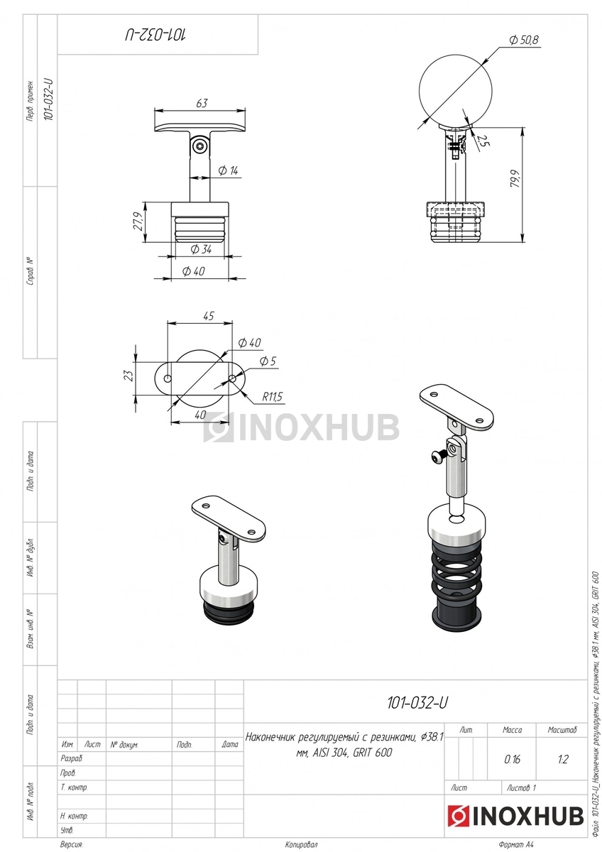 Наконечник с ложементом (Ø50.8) регулируемый с резинками, Ø38.1 мм, AISI 304, GRIT 600, в соответствии отраслевым стандартам из коррозионно-стойкого материала. Изделие применяется в составе металлических, стеклянных или комбинированных конструкций, где важны точные размеры, прочность соединений и стабильность в эксплуатации. Может использоваться при внутреннем и наружном монтаже — в зависимости от поставленной задачи и совместимых компонентов.