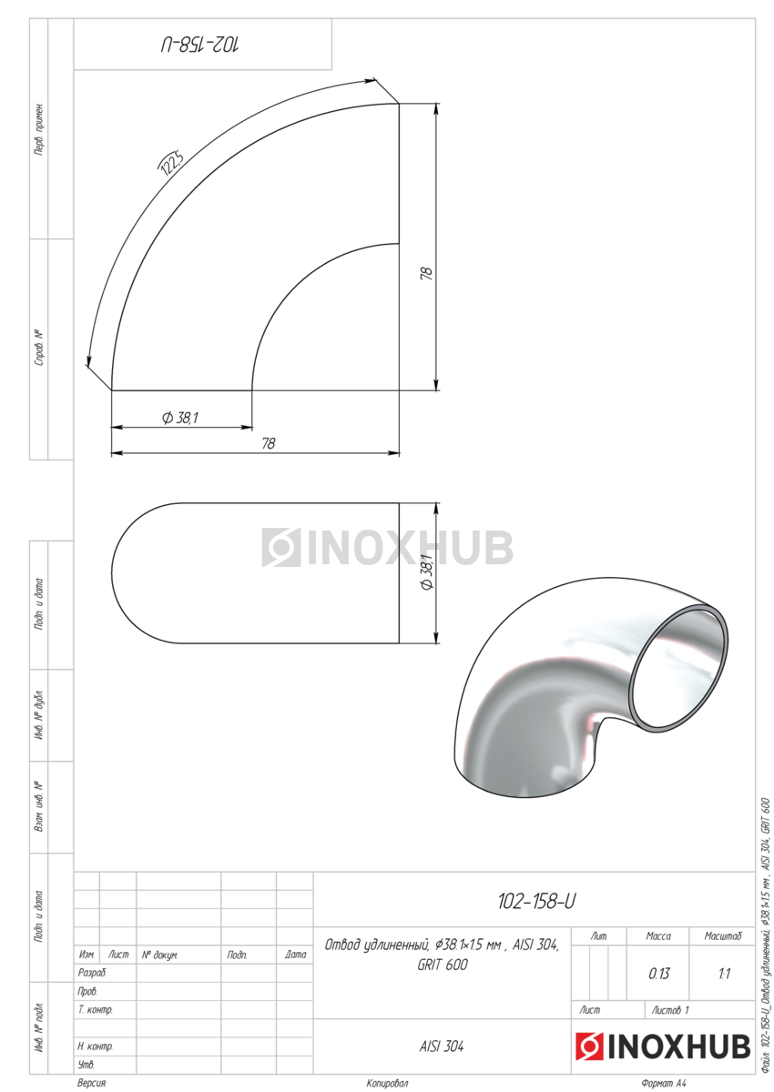Отвод удлиненный, Ø38.1×1.5 мм, AISI 304, GRIT 600 в продаже. Оперативная доставка со склада в Москве. Все товары соответствуют стандартам качества.