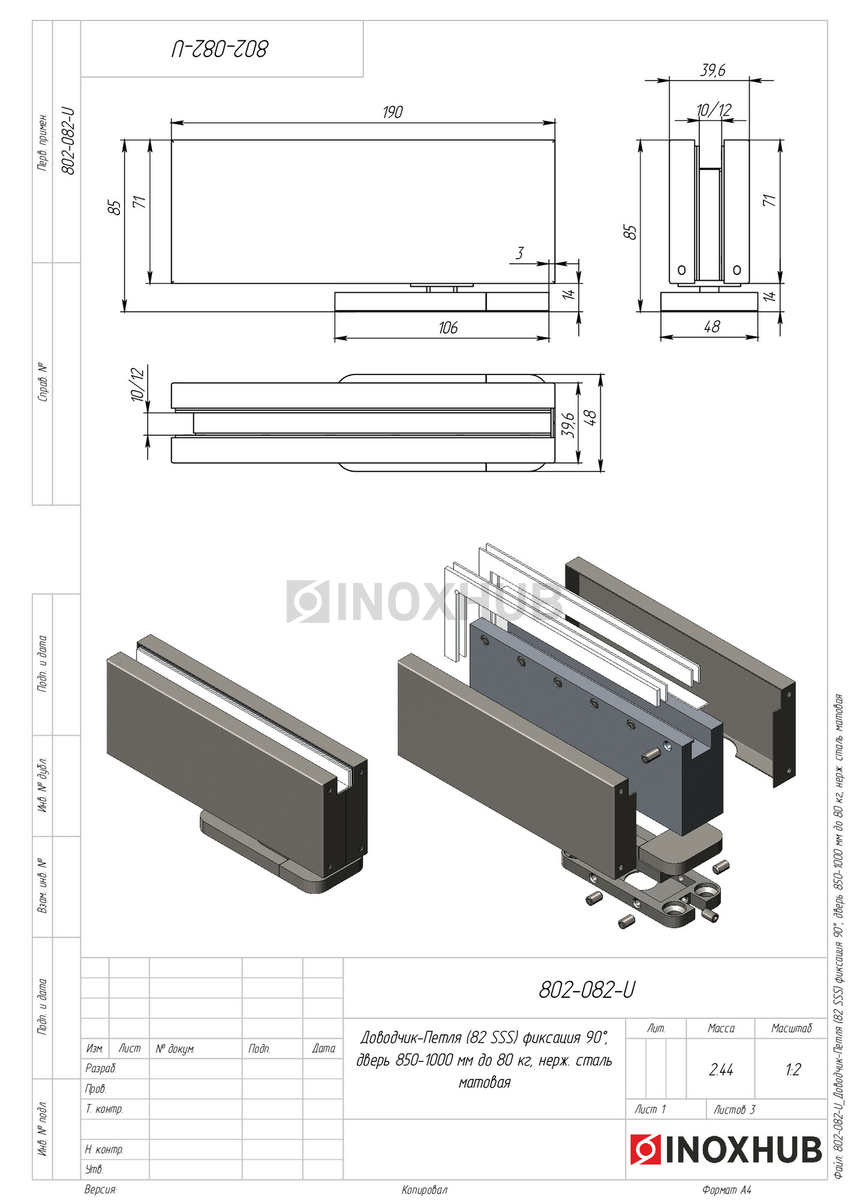 Доводчик-петля, 82 SSS, выполнен из современных высокопрочных материалов. Крышки из качественной матированной нержавеющей стали придают изделию эстетичный вид и классический дизайн. Доводчик предназначен для монтажа на чистовое покрытие пола без заглубления. Рекомендуемая ширина полотна 850 - 950 мм, вес двери до 80 кг. Петля-доводчик, 82 SSS устанавливается на стекло 10-12 мм. Данный доводчик подходит для эксплуатации строго во внутренних помещениях!