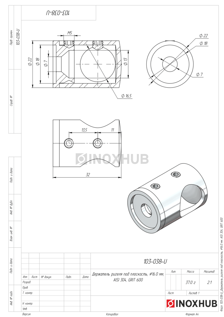 Держатель ригеля под плоскость, Ø16.0 мм, AISI 304, GRIT 600, в соответствии отраслевым стандартам из коррозионно-стойкого материала. Изделие применяется в составе металлических, стеклянных или комбинированных конструкций, где важны точные размеры, прочность соединений и стабильность в эксплуатации. Может использоваться при внутреннем и наружном монтаже — в зависимости от поставленной задачи и совместимых компонентов.