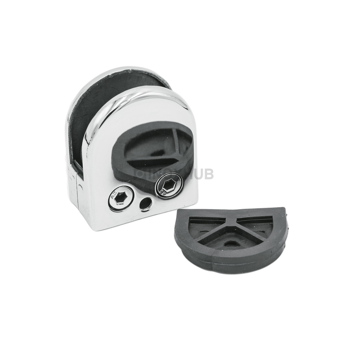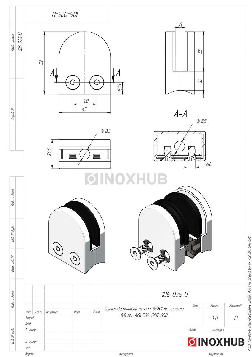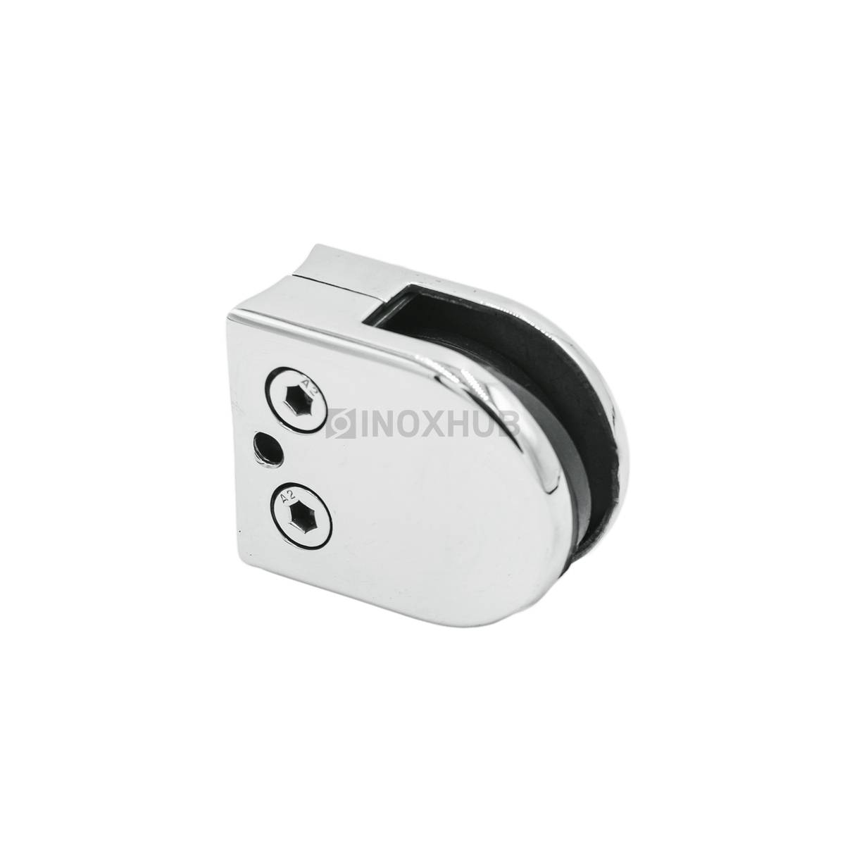 Штампованный зажимной стеклодержатель. Выполнен из стали AISI 304, имеет полированную поверхность — GRIT 600.