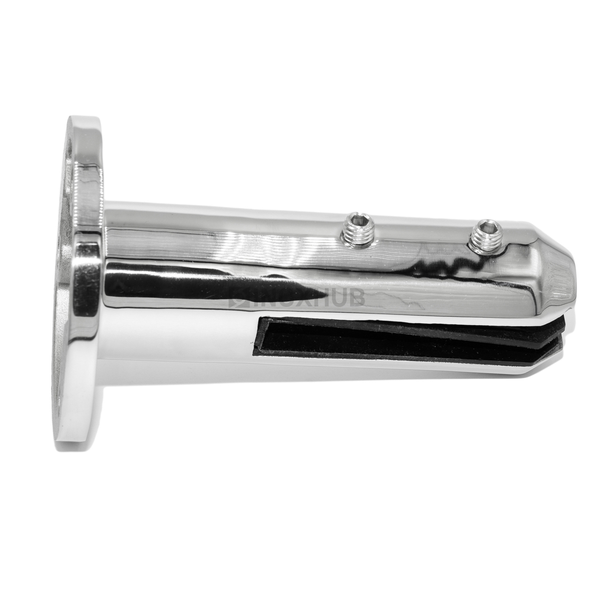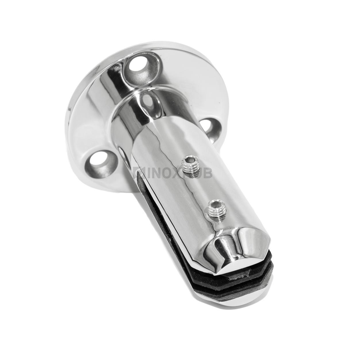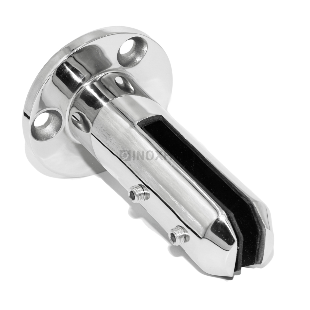 Нержавеющий стеклодержатель изготовлен методом литья из стали марки AISI 316. Крепление можно использовать в помещениях, на улице, вблизи водоемов, а также под воздействием других агрессивных факторов. Поставляется с комплектом уплотнителей, толщину которых можно менять в зависимости от толщины стекла. Подходит для стекол 10-12 мм. Диаметр основания изделия — 100 мм, высота — 160 мм. Поверхность полированная — GRIT 600.