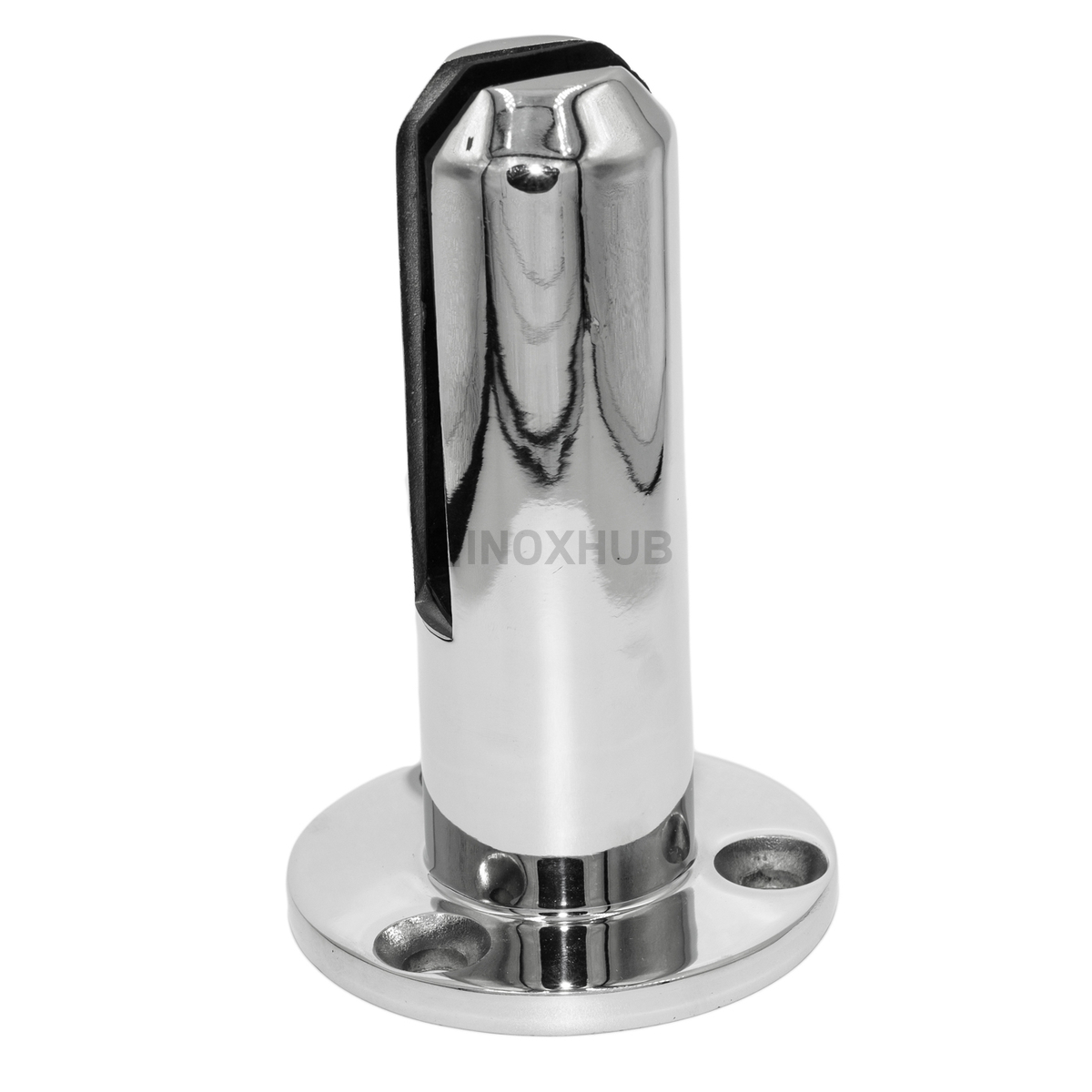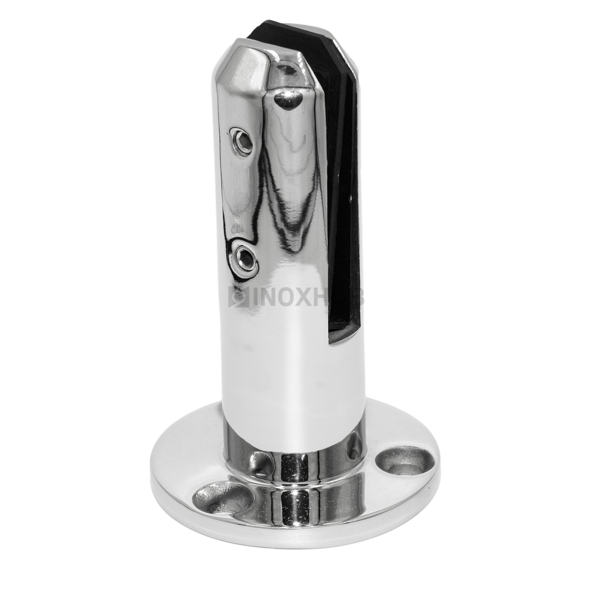 Круглый напольный стеклодержатель. Литая деталь выполнена из стали AISI 304, имеет поверхность GRIT 600 — полированную.