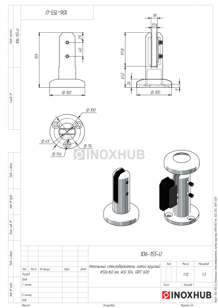 Напольный стеклодержатель литой круглый Ø50×160 мм, AISI 304, GRIT 600, в соответствии отраслевым стандартам из коррозионно-стойкого материала. Изделие применяется в составе металлических, стеклянных или комбинированных конструкций, где важны точные размеры, прочность соединений и стабильность в эксплуатации. Может использоваться при внутреннем и наружном монтаже — в зависимости от поставленной задачи и совместимых компонентов.