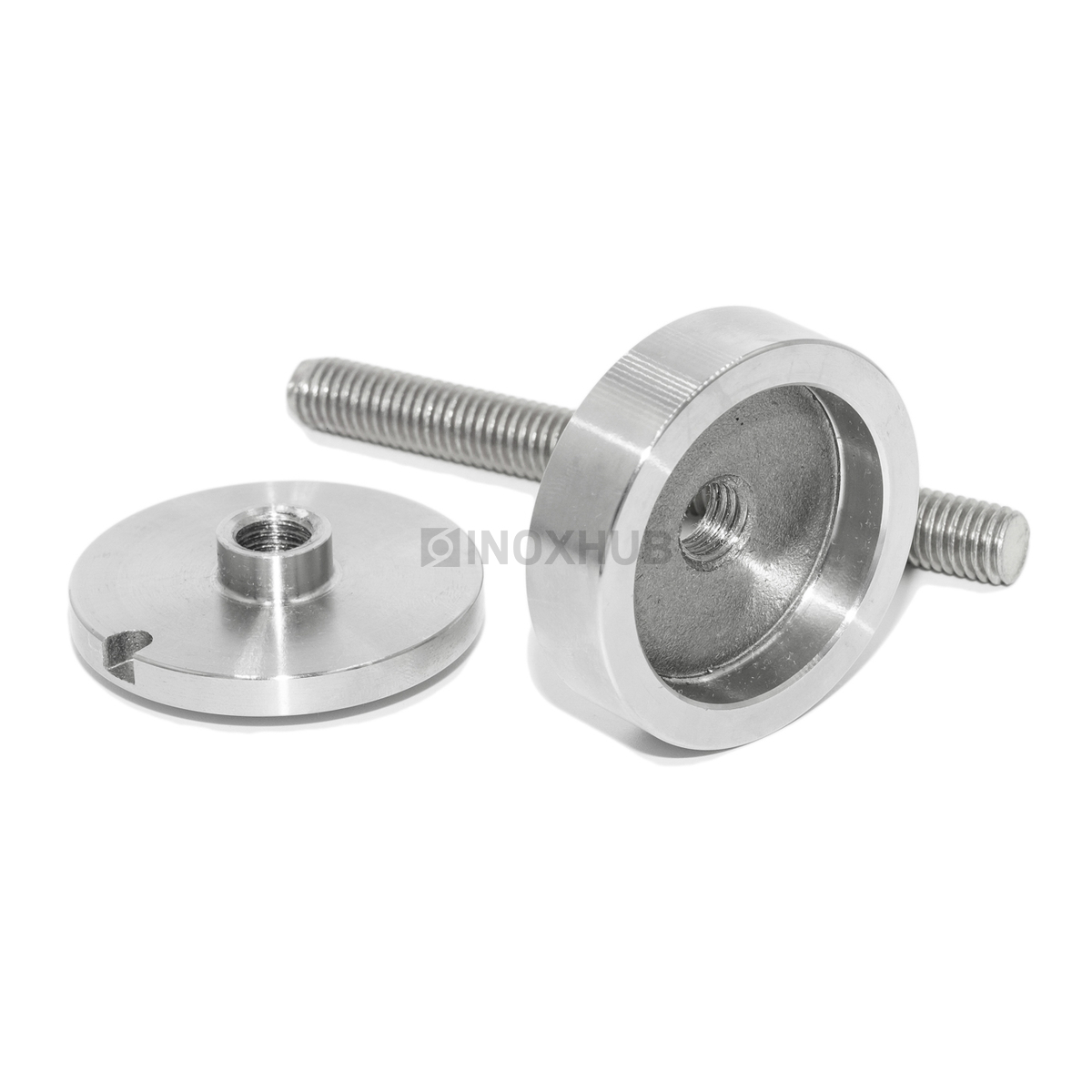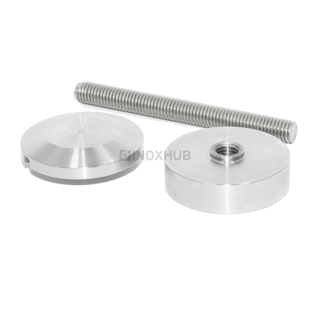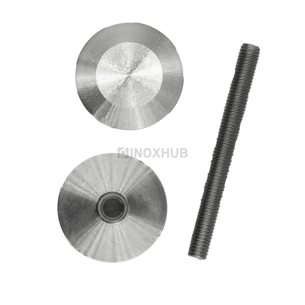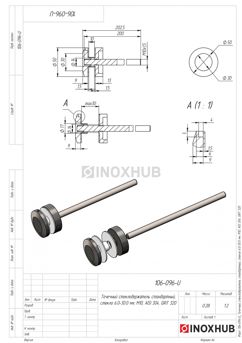 Точечный стеклодержатель с размером шпильки М10 подходит для стекол толщиной 6-30 мм. Шпилька и шайбы изготовлены из стали марки AISI 304, поэтому их можно эксплуатировать на улице. Длина шпильки — 200 мм, диаметр шайб — 50 мм. Поверхность шлифованная GRIT 320.