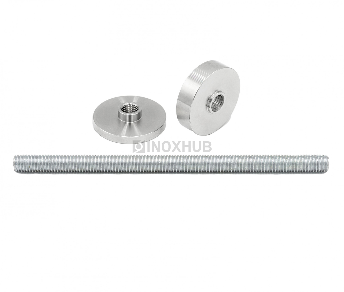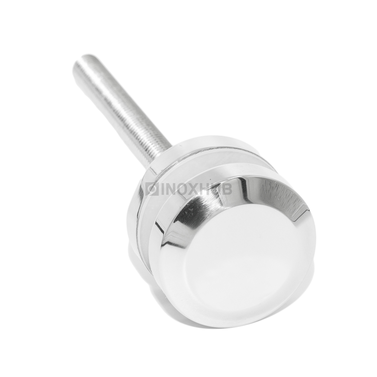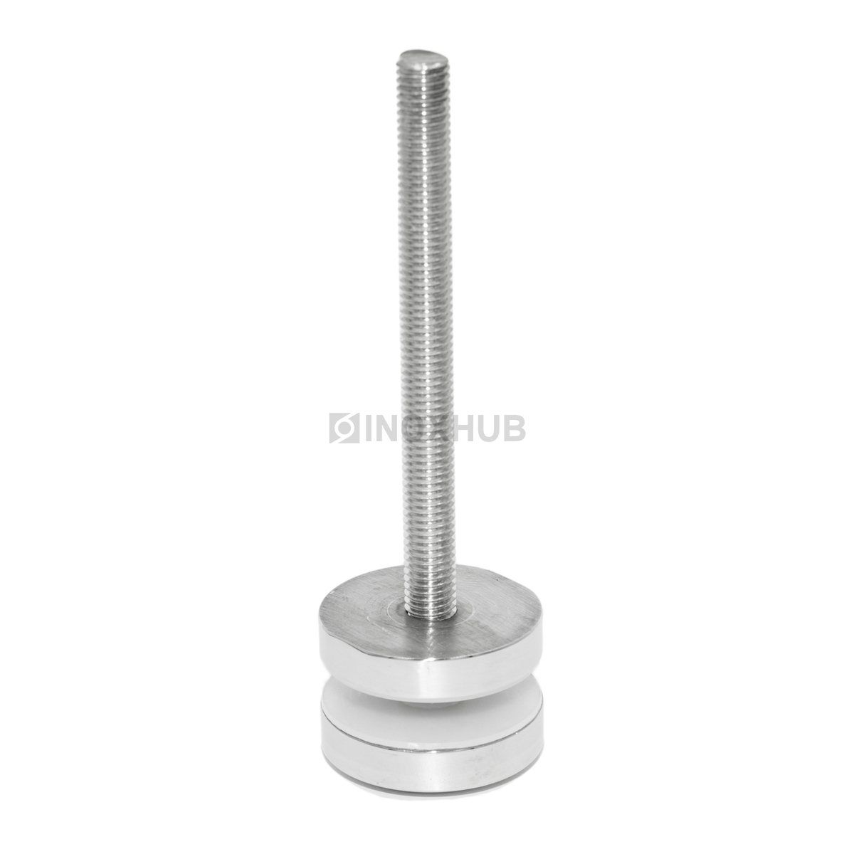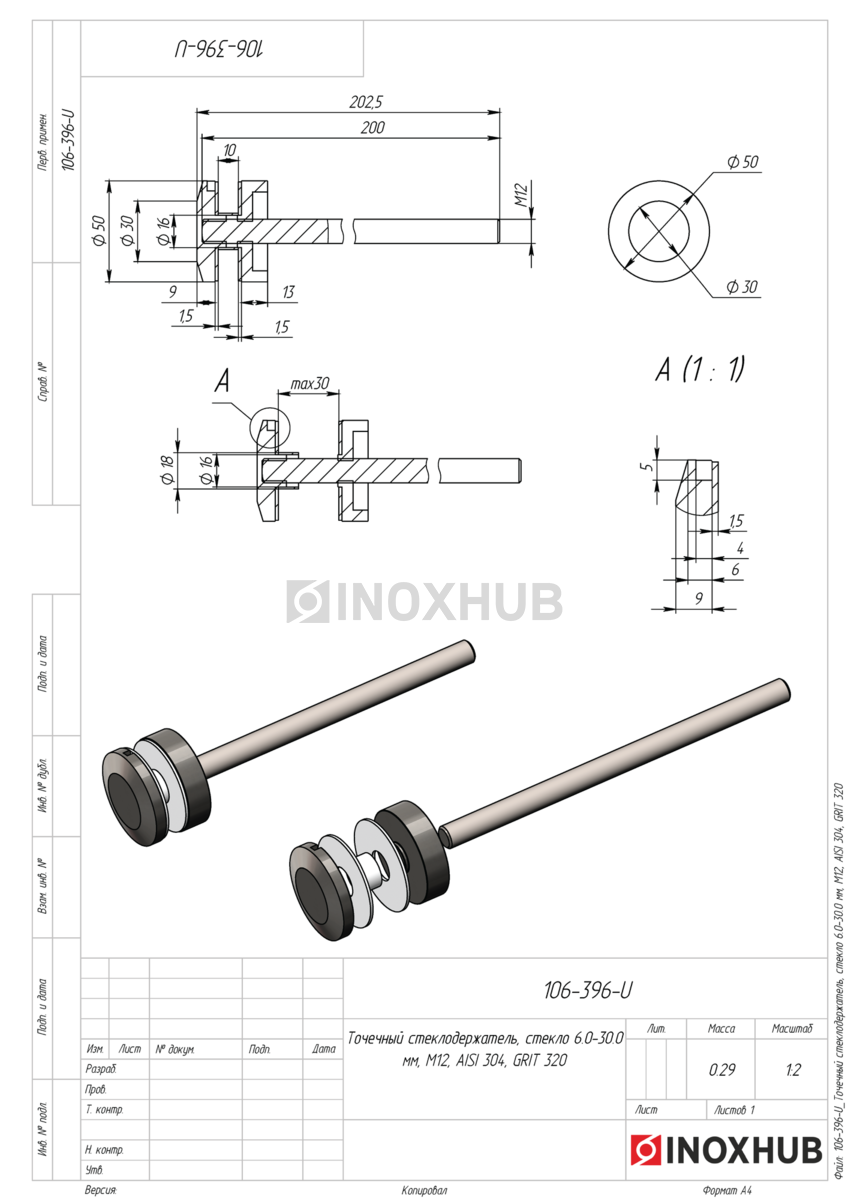 Точечный стеклодержатель размером шпильки М12 подходит для стекол толщиной 6-30 мм. Шпилька и шайбы изготовлены из стали марки AISI 304, поэтому их можно эксплуатировать на улице. Длина шпильки — 200 мм, диаметр шайб — 50 мм. Поверхность шлифованная GRIT 320.
