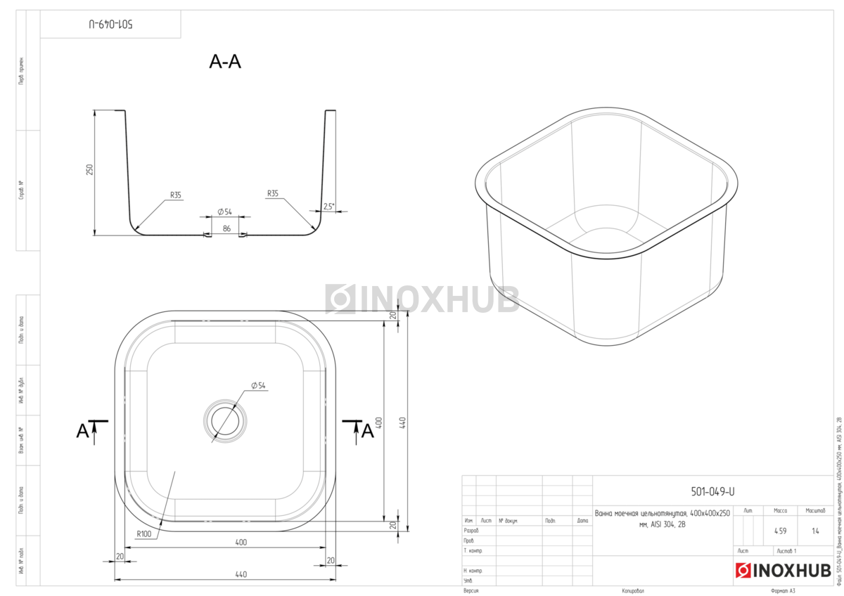 Моечная ванна изготовлена из цельного листа нержавеющей стали AISI 304, без швов и стыков. Используемая в производстве сталь обладает повышенным качеством, изделие устойчиво к износу, в том числе коррозии. Поверхность матовая — 2B, благодаря чему она дольше сохраняет свои эстетические качества (на ней не будут заметны царапины и т.п.). Размеры изделия — 400×400×250 мм, диаметр отверстия — Ø54 мм.