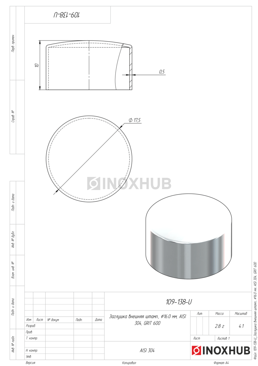 Заглушка внешняя штамп., Ø16.0 мм, AISI 304, GRIT 600 в продаже. Оперативная доставка со склада в Москве. Все товары соответствуют стандартам качества.