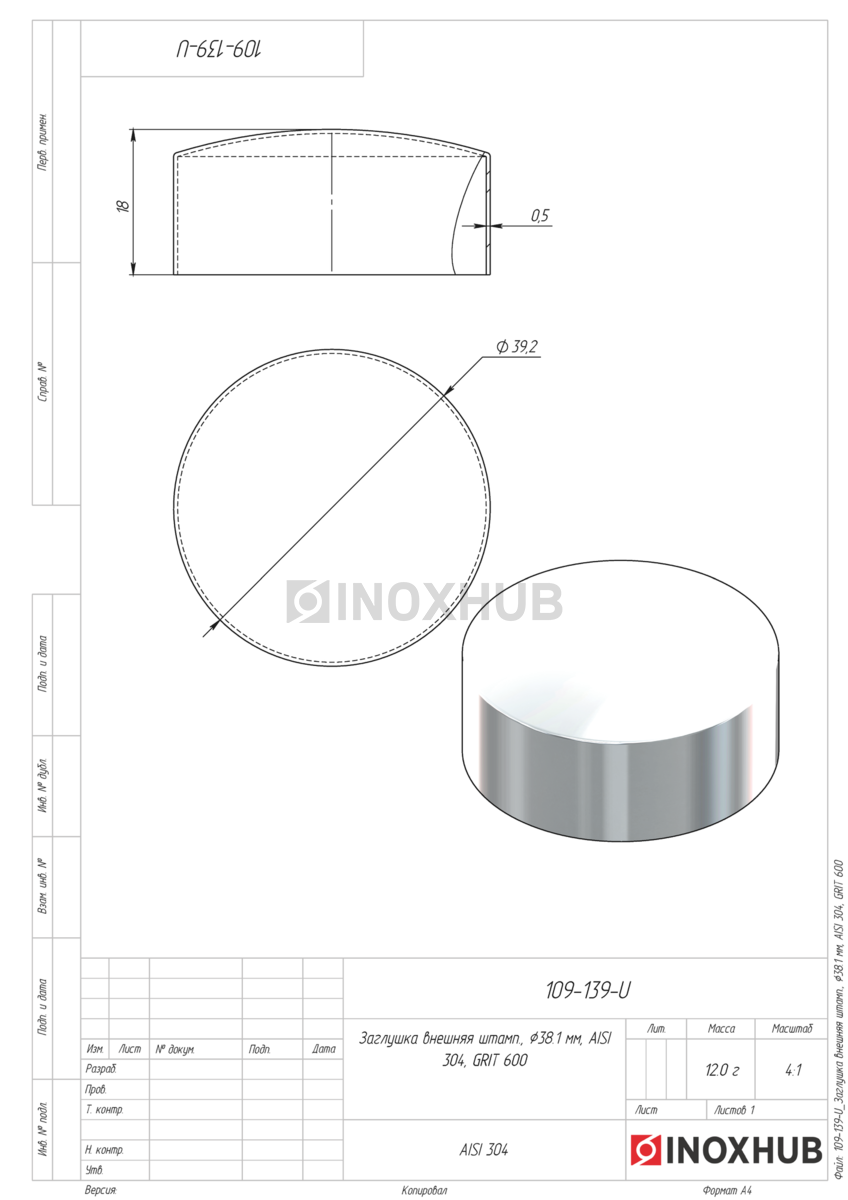 Заглушка внешняя штамп., Ø38.1 мм, AISI 304, GRIT 600 в продаже. Оперативная доставка со склада в Москве. Все товары соответствуют стандартам качества.