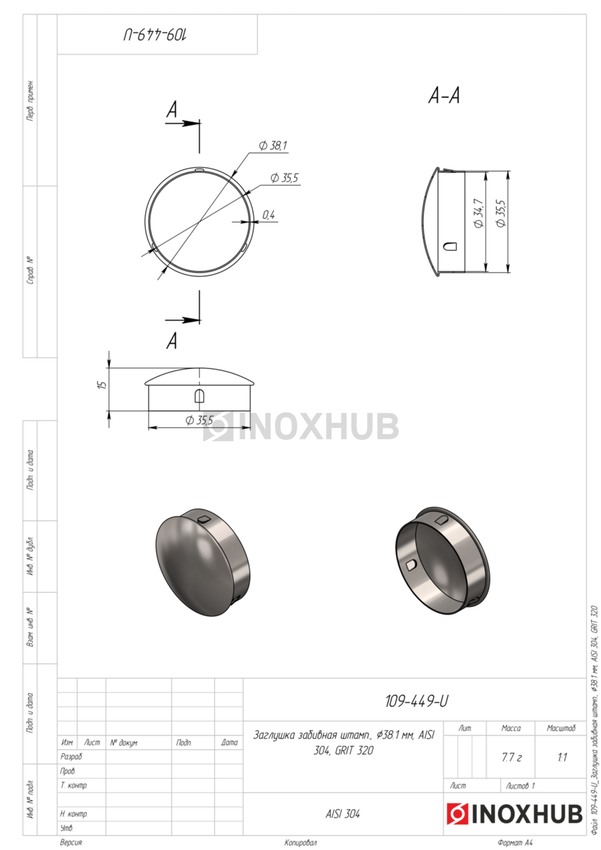 Заглушка забивная штамп., Ø38.1 мм, AISI 304, GRIT 320 в продаже. Оперативная доставка со склада в Москве. Все товары соответствуют стандартам качества.