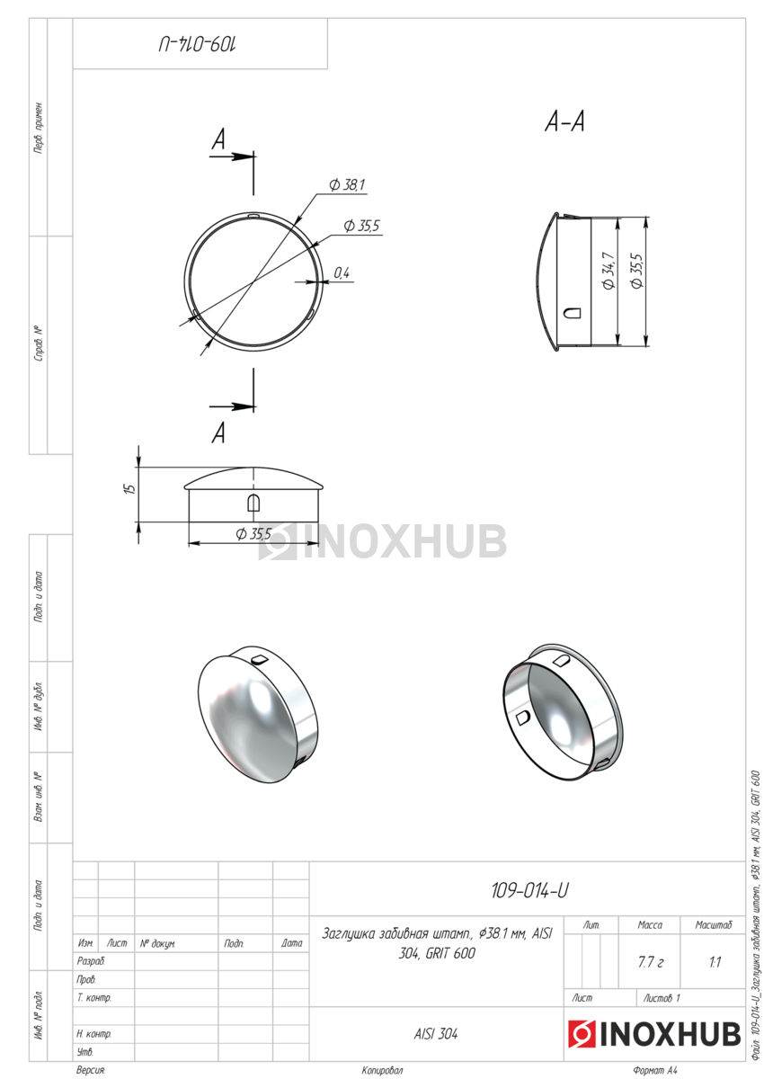 Заглушка забивная штамп., Ø38.1 мм, AISI 304, GRIT 600 в продаже. Оперативная доставка со склада в Москве. Все товары соответствуют стандартам качества.