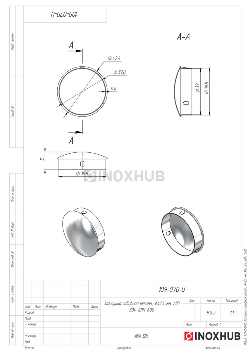 Заглушка забивная штамп., Ø42.4 мм, AISI 304, GRIT 600 в продаже. Оперативная доставка со склада в Москве. Все товары соответствуют стандартам качества.