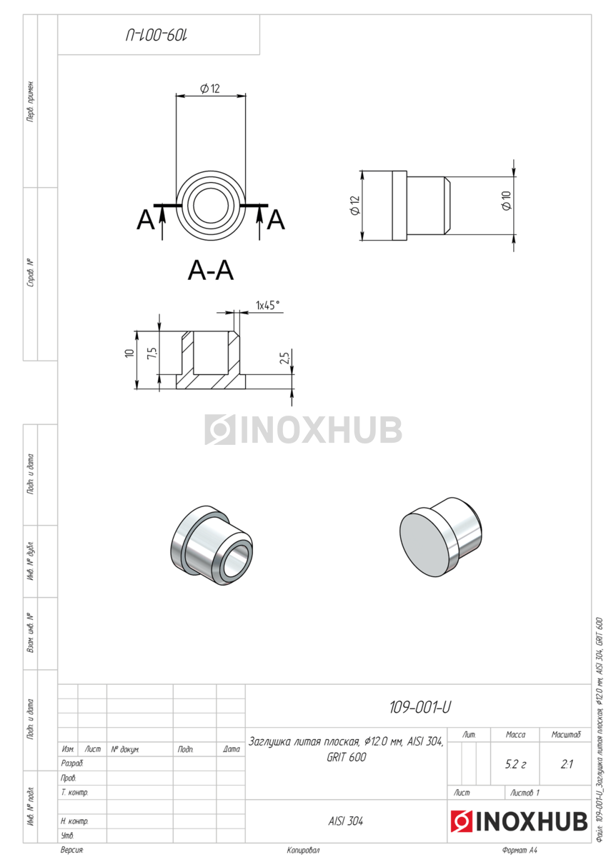 Заглушка литая плоская, Ø12.0 мм, AISI 304, GRIT 600 в продаже. Оперативная доставка со склада в Москве. Все товары соответствуют стандартам качества.