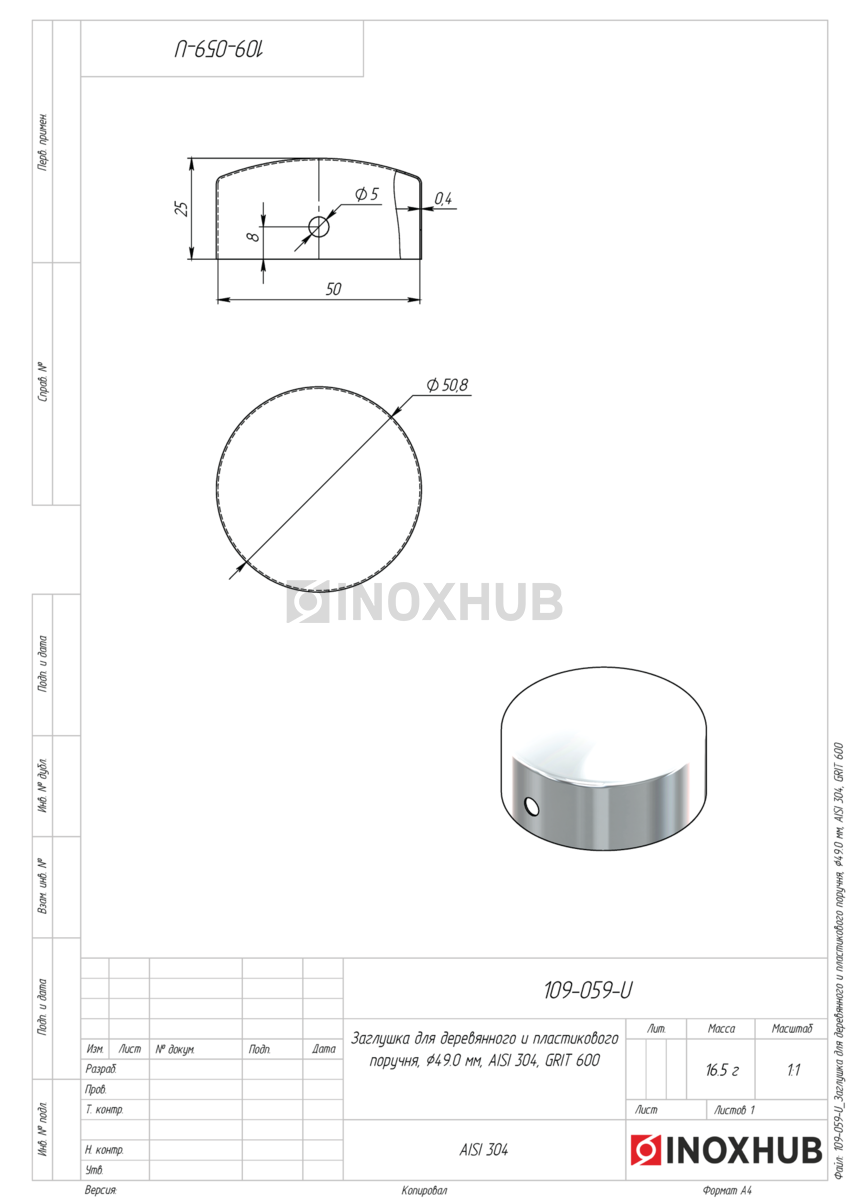 Заглушка для деревянного и пластикового поручня, Ø49.0 мм, AISI 304, GRIT 600 в продаже. Оперативная доставка со склада в Москве. Все товары соответствуют стандартам качества.