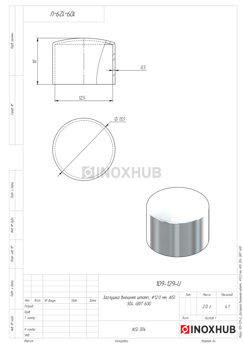 Заглушка внешняя штамп., Ø12.0 мм, AISI 304, GRIT 600 в продаже. Оперативная доставка со склада в Москве. Все товары соответствуют стандартам качества.