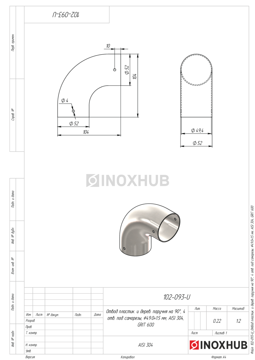 Отвод пластик. и дерев. поручня на 90°, 4 отв. под саморезы, Ø49.0×1.5 мм, AISI 304, GRIT 600, в соответствии отраслевым стандартам из коррозионно-стойкого материала. Изделие применяется в составе металлических, стеклянных или комбинированных конструкций, где важны точные размеры, прочность соединений и стабильность в эксплуатации. Может использоваться при внутреннем и наружном монтаже — в зависимости от поставленной задачи и совместимых компонентов.