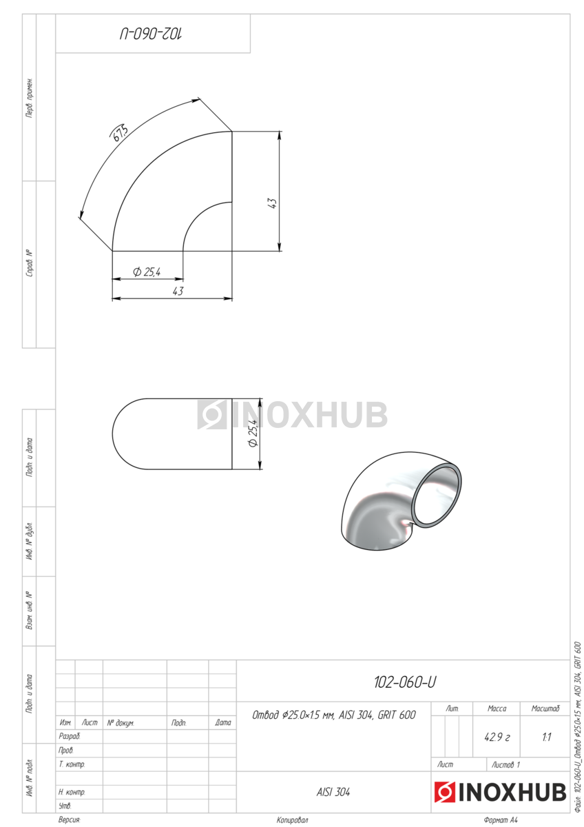 Отвод Ø25.0×1.5 мм, AISI 304, GRIT 600 в продаже. Оперативная доставка со склада в Москве. Все товары соответствуют стандартам качества.