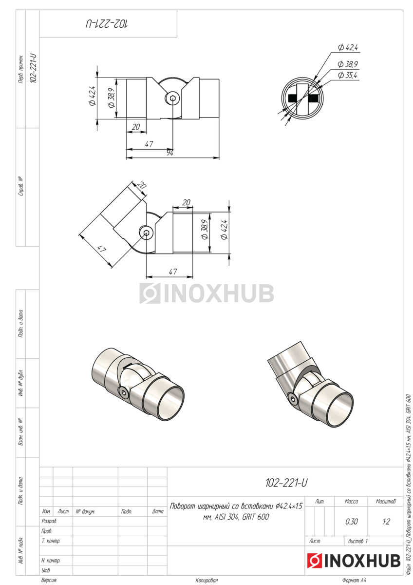 Поворот шарнирный с предусмотренными вставками. Выполнен из высококачественной стали AISI 304. Поверхность изделия маркируется как GRIT 600 — полированная.