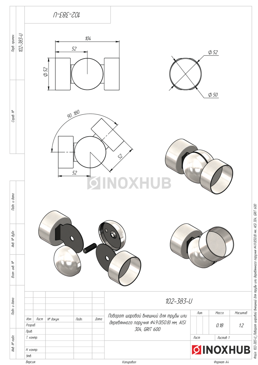 Поворот шаровой внешний для трубы или деревянного поручня, Ø50.8 мм, AISI 304, GRIT 600 в продаже. Оперативная доставка со склада в Москве. Все товары соответствуют стандартам качества.