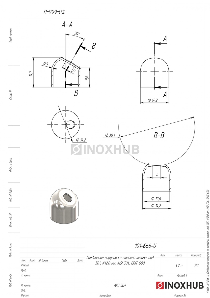 Соединение поручня со стойкой штамп. под 30°, Ø12.0 мм, AISI 304, GRIT 600 в продаже. Оперативная доставка со склада в Москве. Все товары соответствуют стандартам качества.