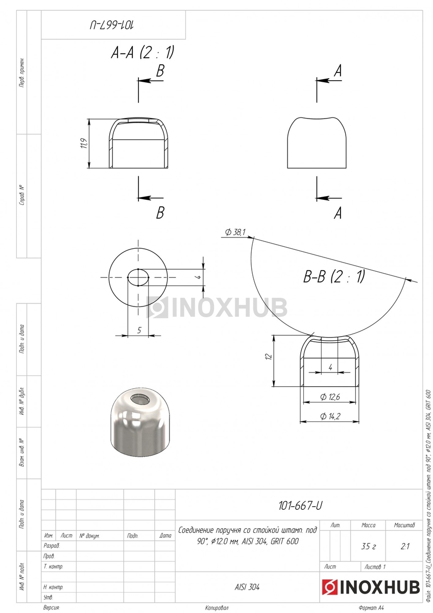 Штампованное соединение поручня со стойкой диаметром 12 мм. Представляет собой металлическую полую полусферу с выемкой под трубу и отверстием. Выполнено из стали AISI 304. Имеет полированную поверхность. Предназначено для поручня диаметром 38,1 мм.