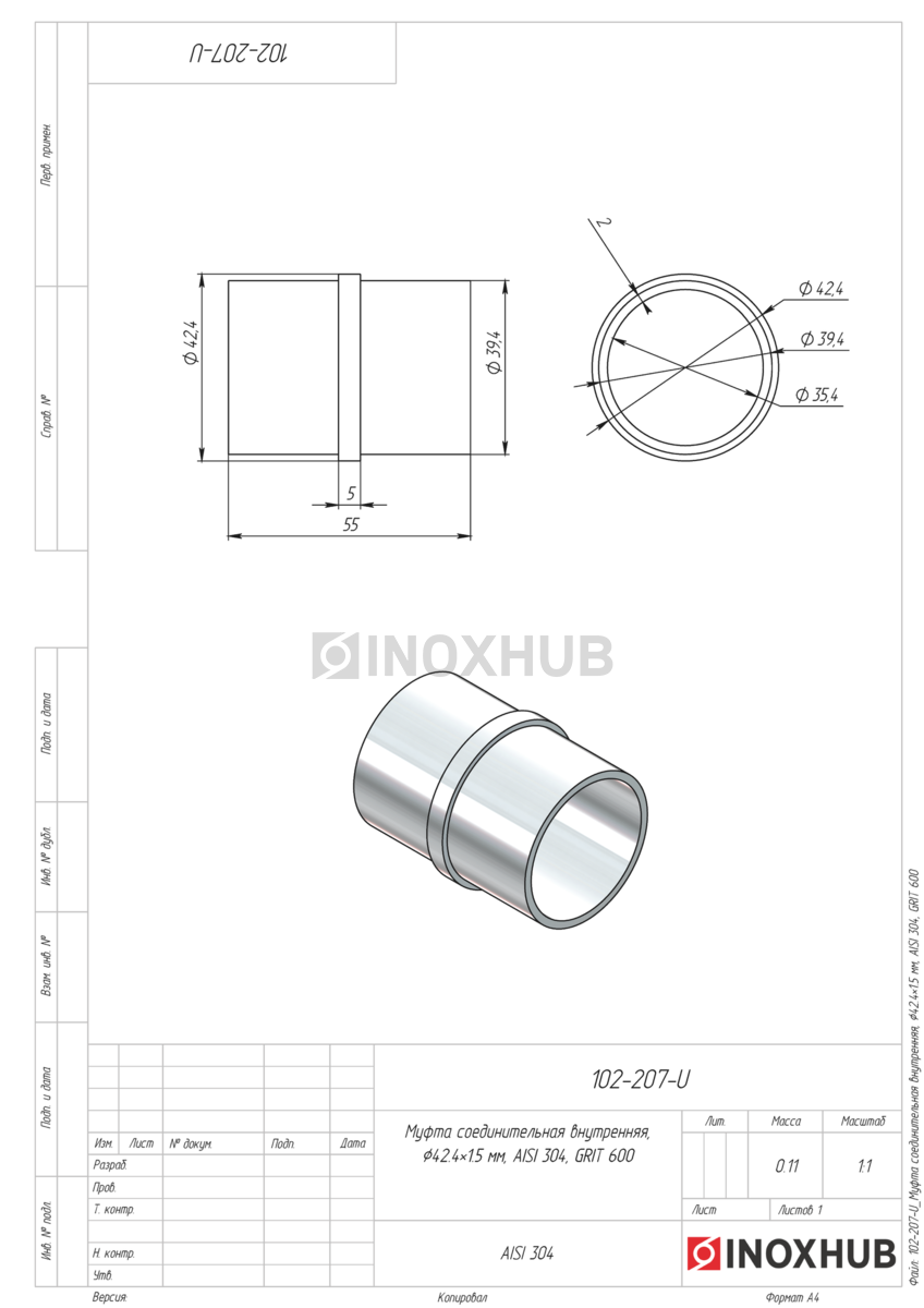 Соединительная муфта внутренняя, Ø42.4×1.5 мм, AISI 304, GRIT 600 в продаже. Оперативная доставка со склада в Москве. Все товары соответствуют стандартам качества.