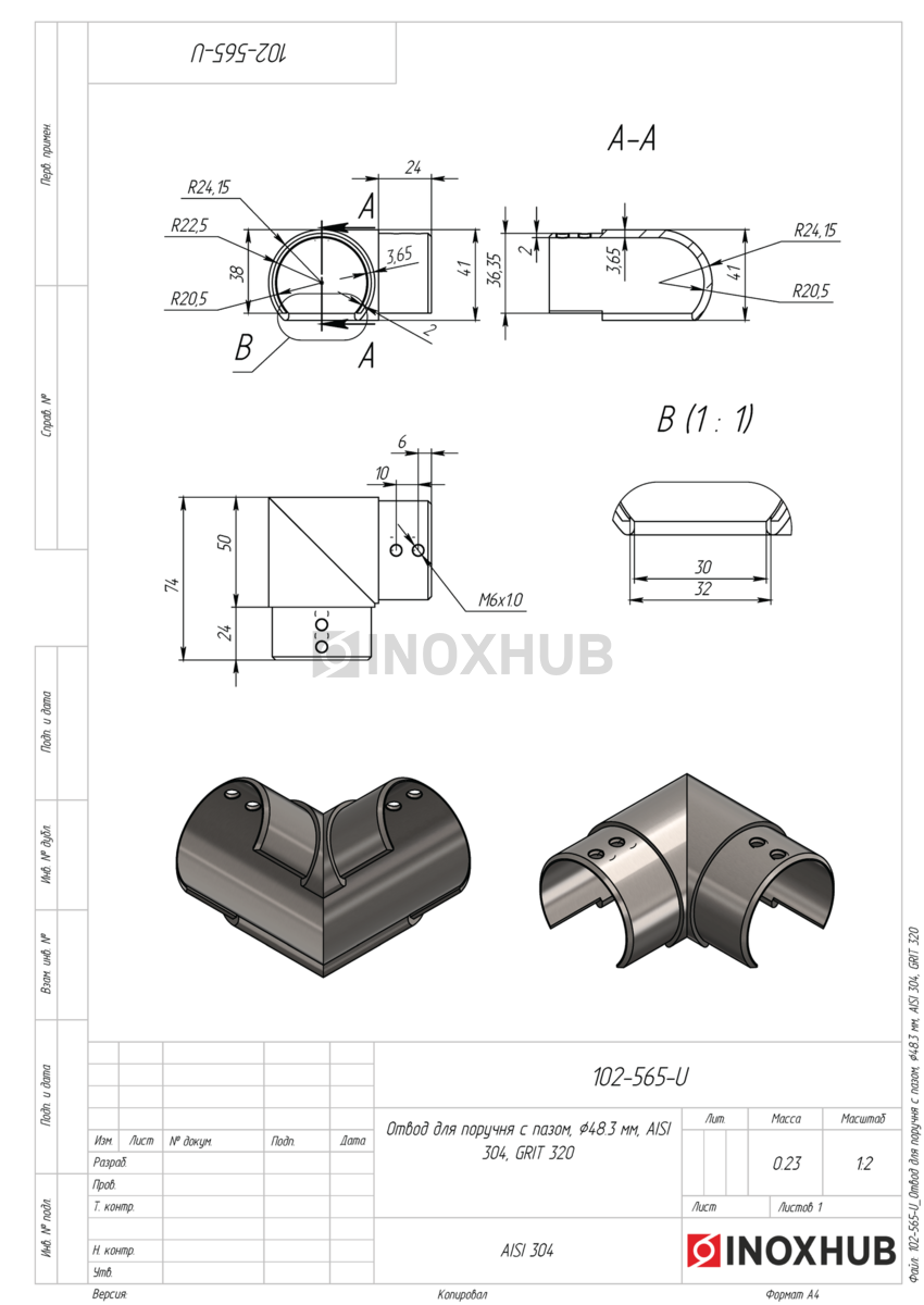 Отвод поручня с пазом для трубы 48,3 мм. Выполнен из высококачественной стали AISI 304. Представляет собой литую деталь с матовой поверхностью GRIT 320.