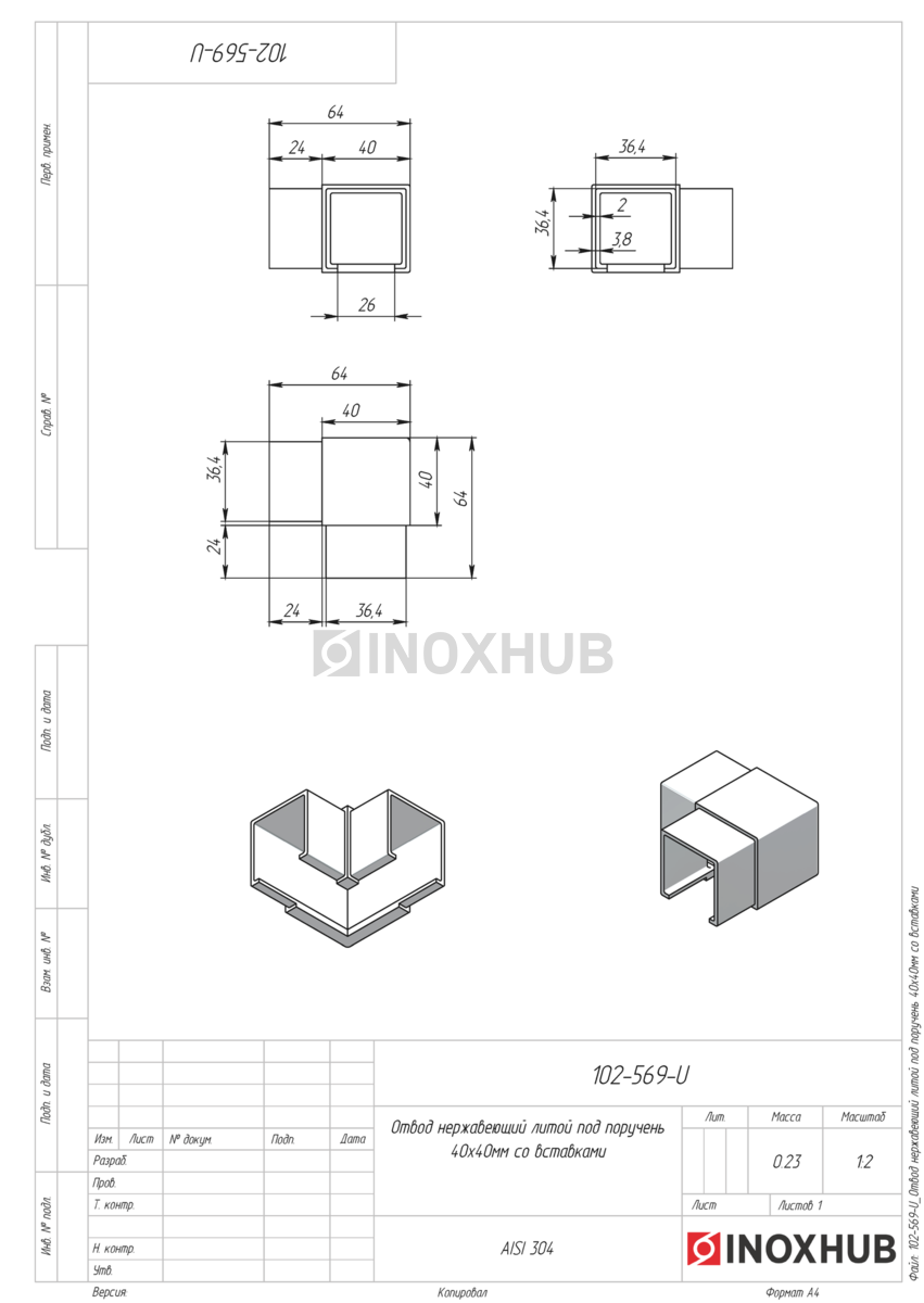 Отвод для поручня с пазом, 40.0×40.0 мм, AISI 304, GRIT 600 в продаже. Оперативная доставка со склада в Москве. Все товары соответствуют стандартам качества.