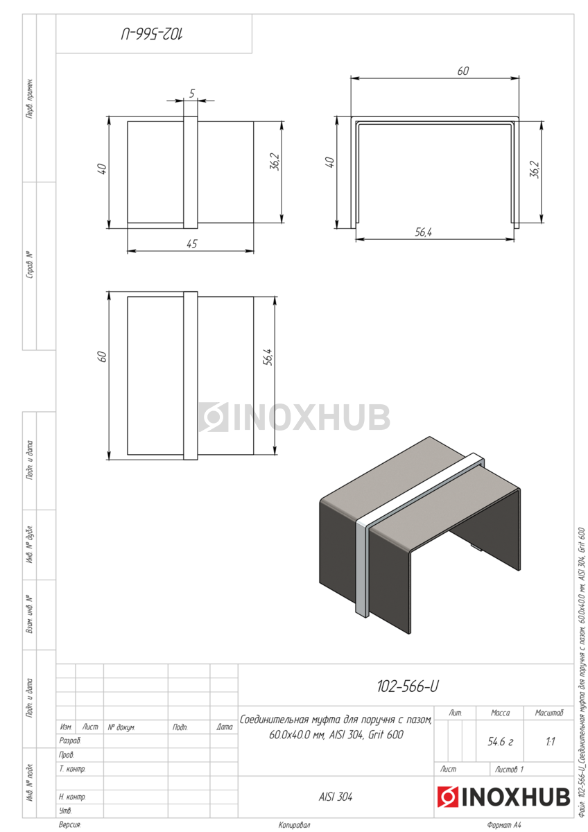 Соединительная муфта для поручня с пазом, 60.0×40.0 мм, AISI 304, GRIT 600 в продаже. Оперативная доставка со склада в Москве. Все товары соответствуют стандартам качества.