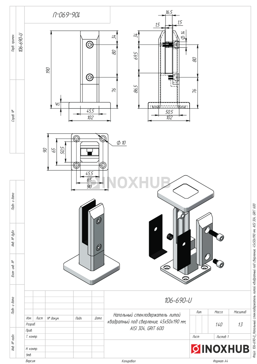 Напольный стеклодержатель литой квадратный под сверление, 45×50×190 мм, AISI 304, GRIT 600 в продаже. Оперативная доставка со склада в Москве. Все товары соответствуют стандартам качества.