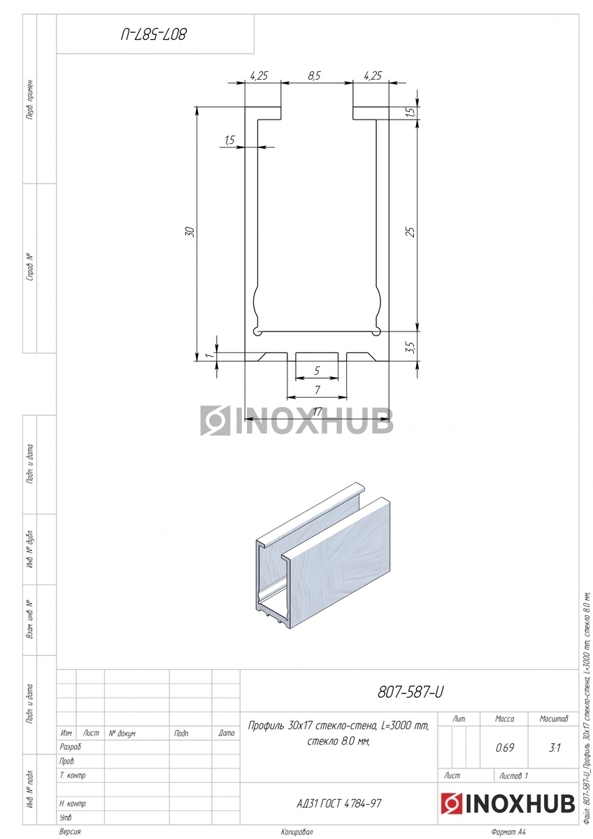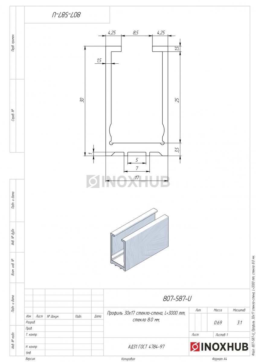 Профиль (587 al) стекло-стена, 30×17 мм L=3000 мм, стекло 8.0 мм, полированный алюминий в продаже. Оперативная доставка со склада в Москве. Все товары соответствуют стандартам качества.